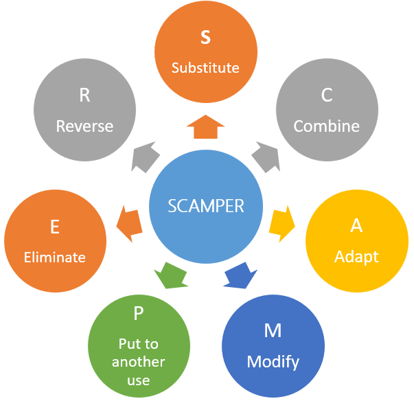 تکنیک SCAMPER برای اولین بار توسط Bob Eberle معرفی شد تا به سوالات هدفمند، که در حل و فصل مسائل و طوفان فکری مطرح می شود، پاسخ دهد. نام SCAMPER مخفف هفت تکنیک مختلف