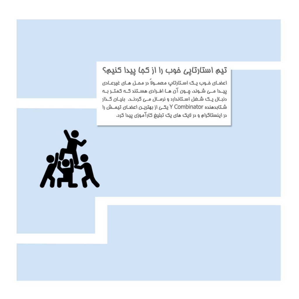 اعضای خوب یک استارتاپ معمولاً در محل های غیرعادی پیدا می شوند، چون آن ها افرادی هستند که کمتر به دنبال یک شغل استاندارد و نرمال می گردند. برای مثال بنیان گذار شتابدهنده Y Combinator یکی از بهترین اعضای تیمش را در اینستاگرام و در لایک های یک تبلیغ کارآموزی پیدا کرد. او یک دختر 22 ساله و دانش آموز سال آخر کالج بود که هم اکنون نقش مهمی در این شتابدهنده ایفا می کند. خیلی از افراد خبره و کار بلد، برای همکاری در شرکت های بزرگ مناسب تر هستند تا شرایط کاری استارتاپی با منابع محدود، اقدامات سریع و همکاری همه جانبه.