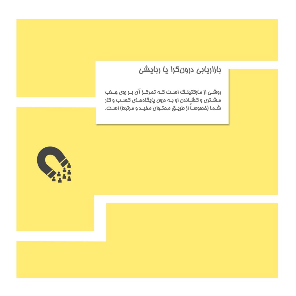 بازاریابی ربایشی یا درونگرا (Inbound Marketing) روشی از مارکتینگ است که تمرکز آن بر روی جذب مشتری و کشاندن او به درون پایگاههای کسب و کار شما (خصوصاً از طریق محتوای مفید و مرتبط) است. معمولاً در این روش، پایگاه اصلی شما، وبسایتتان محسوب میشود و صفحات شما در شبکههای اجتماعی نیز پایگاههای دیگر شما هستند. در حقیقت، در بازاریابی ربایشی، شما به جای آنکه وقت و هزینه خود را صرف پیدا کردن مشتری کنید، آن را صرف افزایش کیفیت رسانههای خود میکنید. با این هدف که کاری کنید مشتری در زمان نیاز، شما را پیدا کند، پس از آن در مسیر خرید هدایت شود و در هر مرحله از مسیر خود، چیزی با ارزش از شما دریافت نماید. ایجاد رابطه صمیمی با مشتری در این روش، اهمیّت بسیار زیادی دارد. در واقع، هدف کلی شما ایجاد یک مسیر برای مشتری است. مسیری که در طی آن، غریبهها تبدیل به دوستان شما میشوند. دوستانی که اعتماد کاملی به شما دارند. یکی از اصلیترین مواردی که در بازاریابی درونگرا باید به آن توجه کرد، محتوا است. استفاده از هر مدل محتوا شامل، متن و مقاله، عکس، ویدیو و فایل صوتی میتواند بسیار برای شما حیاتی باشد.